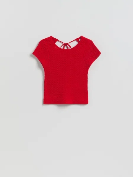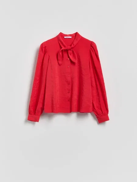 Атласні червоні блузки зазвичай скроєні в мінімалістичному стилі або прикрашені спеціальними бантами, стрічками, мають драпіроване декольте. Блузки у вигляді типових, універсальних сорочок, футболок, ідеальні як невід'ємне доповнення до стилю кежуал. Червоні блузки з вшитим мереживом, квітковими або пташиними принтами, моделі в клітинку або добре відомі і популярні блузки-сорочки чудово поєднуються як з брюками, так і зі спідницями.