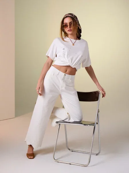 Sinsay Джинси wide leg із середньою посадкою та ажурним оздобленням штанини кремовий