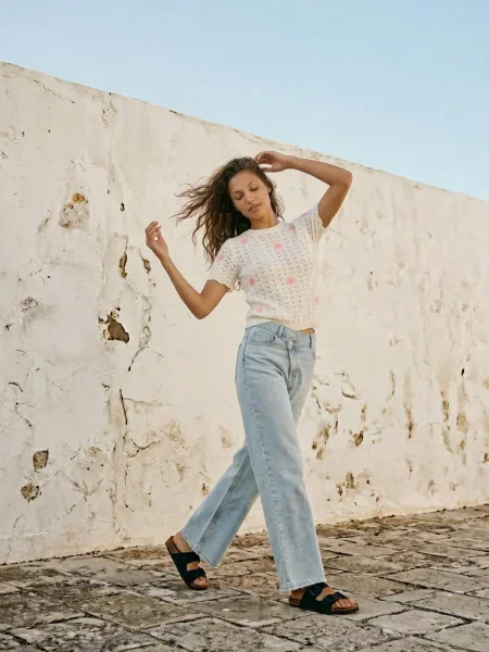 Sinsay Делікатний светр з коротким рукавом і вишитими квітами кремовий